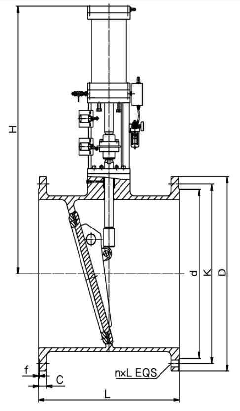 1、蝶板采用大角度斜置,缩短启闭行程,并有气(液)或弹簧压助关,实现快速关闭。